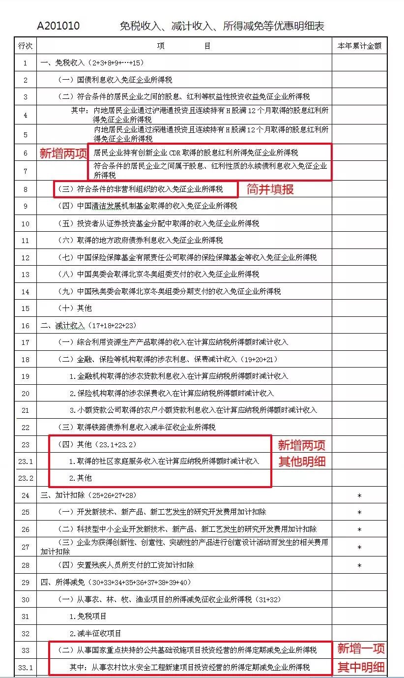 本次修订共涉及5张表单,其中3张表单调整表单样式,2张表单仅修改填报说明。 3张表单调整样式 (1)《免税收入、减计收入、所得减免等优惠明细表》(A201010) 表样调整后,符合条件的非营利组织的收入免征企业所得税优惠政策事项,不再划分不同类别,而是一并填入“(三)符合条件的非营利组织的收入免征企业所得税”行次,同时该行次从第6行调整至第8行。 2、在原表(二)符合条件的居民企业之间的股息、红利等权益性投资收益免征企业所得税”项目下,增加两个“其中”项内容: (1)居民企业持有创新企业CDR取得的股息红利所得免征企业所得税 (2)符合条件的居民企业之间属于股息、红利性质的永续债利息收入免征企业所得税” 填报说明:用于纳税人填报享受居民企业持有创新企业CDR取得的股息红利所得征免企业所得税政策和永续债利息收入适用企业所得税法规定的居民企业之间的股息、红利等权益性投资收益免征企业所得税规定政策的税收优惠情况。 3、在原表第23行“(四)其他”项目下,增加两项内容: (1)取得的社区家庭服务收入在计算应纳税所得额时减计收入 (2)其他 填报说明:用于纳税人填报享受社区家庭服务收入减按90%计入应纳税所得额政策的税收优惠情况和申报表未列明的其他减计收入的税收优惠情况。 4、在原表第33行“(二)从事国家重点扶持的公共基础设施项目投资经营的所得定期减免企业所得税”项目下,增加1个“其中”项内容“其中:从事农村饮水安全工程新建项目投资经营的所得定期减免企业所得税” 填报说明:用于农村饮水安全工程运营管理单位填报享受从事农村饮水安全工程新建项目投资经营的所得定期减免企业所得税政策的税收优惠情况。 (2)《减免所得税优惠明细表》(A201030) 在原表第28行“二十八、其他”项目下,增加两项内容: 1.从事污染防治的第三方企业减按15%的税率征收企业所得税 2.其他 填报说明:用于从事污染防治的第三方企业填报享受减按15%的税率征收企业所得税政策的税收优惠情况和其他优惠情况填报。 (3)《中华人民共和国企业所得税月(季)度预缴和年度纳税申报表(B类,2018年版)》(B100000) (1)居民企业持有创新企业CDR取得的股息红利所得免征企业所得税 (2)符合条件的居民企业之间属于股息、红利性质的永续债利息收入免征企业所得税 填报说明:用于纳税人填报享受居民企业持有创新企业CDR取得的股息红利所得免征企业所得税政策和永续债利息收入适用企业所得税法规定的居民企业之间的股息、红利等权益性投资收益免征企业所得税规定政策的税收优惠情况。 2、增加第20行“民族自治地方的自治机关对本民族自治地方的企业应缴纳的企业所得税中属于地方分享的部分减征或免征”。 填报说明:用于纳税人填报享受民族自治地方的自治机关对本民族自治地方的企业应缴纳的企业所得税中属于地方分享的部分减征或免征政策的税收优惠情况。 3、增加第21行“本期实际应补(退)所得税额” 填报说明:用于纳税人计算当期实际应补(退)所得税额的需要 2张表单修改填报说明 (1)《固定资产加速折旧(扣除)优惠明细表》(A201020) 变动内容:《财政部 税务总局关于扩大固定资产加速折旧优惠政策适用范围的公告》(财政部 税务总局公告2019年第66号),将固定资产加速折旧企业扩大到所有制造业,所以在填写固定资产加速折旧明细表填写口径时新增了这项政策的内容。 (2)《中华人民共和国企业所得税月(季)度预缴纳税申报表(A类)(A200000) 变动内容:第4行“特定业务计算的应纳税所得额”:从事房地产开发等特定业务的纳税人,填报按照税收规定计算的特定业务的应纳税所得额。房地产开发企业销售未完工开发产品取得的预售收入,按照税收规定的预计计税毛利率计算的预计毛利额填入此行。 a.取消企业开发产品完工后,其未完工预售环节按照税收规定的预计计税毛利率计算的预计毛利额只能在汇算清缴时调整,月(季)度预缴纳税申报时不调整的限制; b.取消本行填报金额不得小于本年上期申报金额限制。